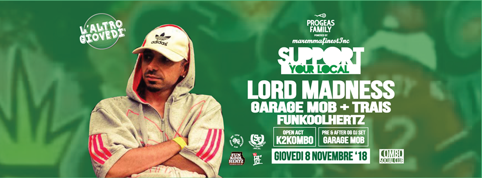 Ecco allora che colgo l’occasione per ricordarvi la prossima tappa, quella di stasera al Combo con Lord Madness. Il rapper romano, nostra vecchia conoscenza dai tempi dei primi A Joint With, sarà preceduto sul palco dai K2Kombo, Funkoolhertz, Garage Mob e Don Trais della Shafy Click. Il paradigma è quello di sempre: un ospite di riferimento e un nutrito gruppo di locali ed emergenti, secondo il concept di Support Your Local.