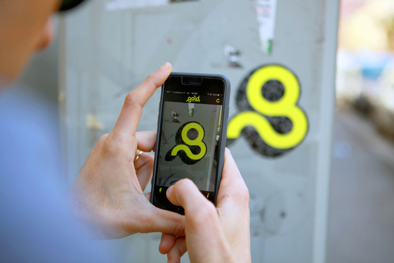 L’applicazione consentiva di inquadrare con lo smartphone gli speciali adesivi piazzati in giro per Firenze ed accedere così a un gioco in realtà aumentata che vede come protagonista una “G” volante che, se colpita correttamente, permetteva di sbloccare sconti nei negozi Gold.