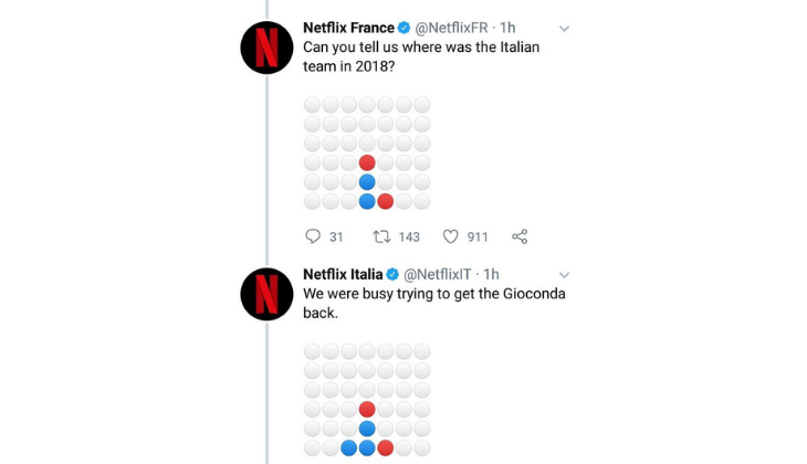 Netflix Italia e Netflix Francia per celebrare l’anniversario della finale del 2006 si sono sfidati a Forza Quattro su twitter accompagnando ogni mossa con frasi divertenti e qualche consiglio su film da vedere.