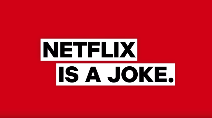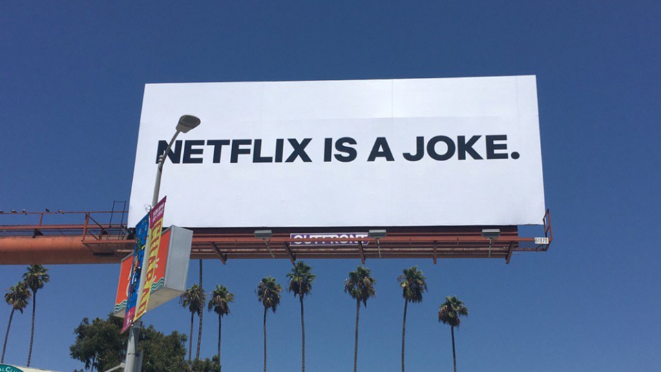 Nel settembre 2017 a Los Angeles e New York erano infatti già comparse diverse affissioni con una scritta che diceva “Netflix is a joke”. Dopo qualche giorno si scoprì che era stata la stessa Netflix a commissionare quei cartelli per lanciare la sua nuova programmazione di spettacoli comici.
