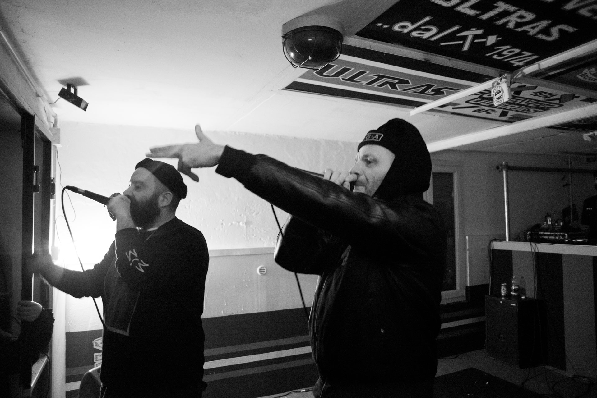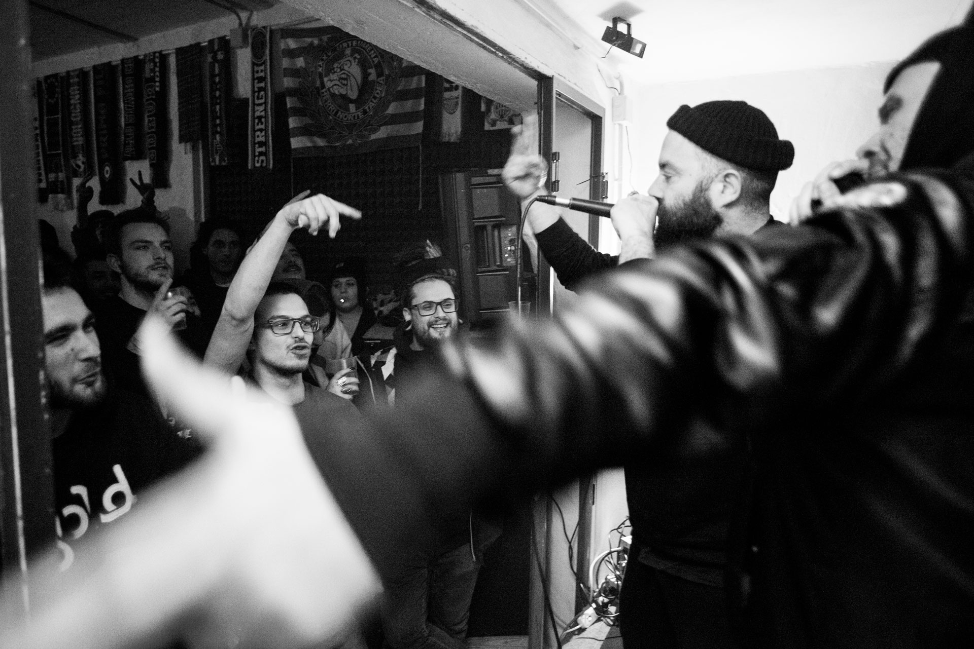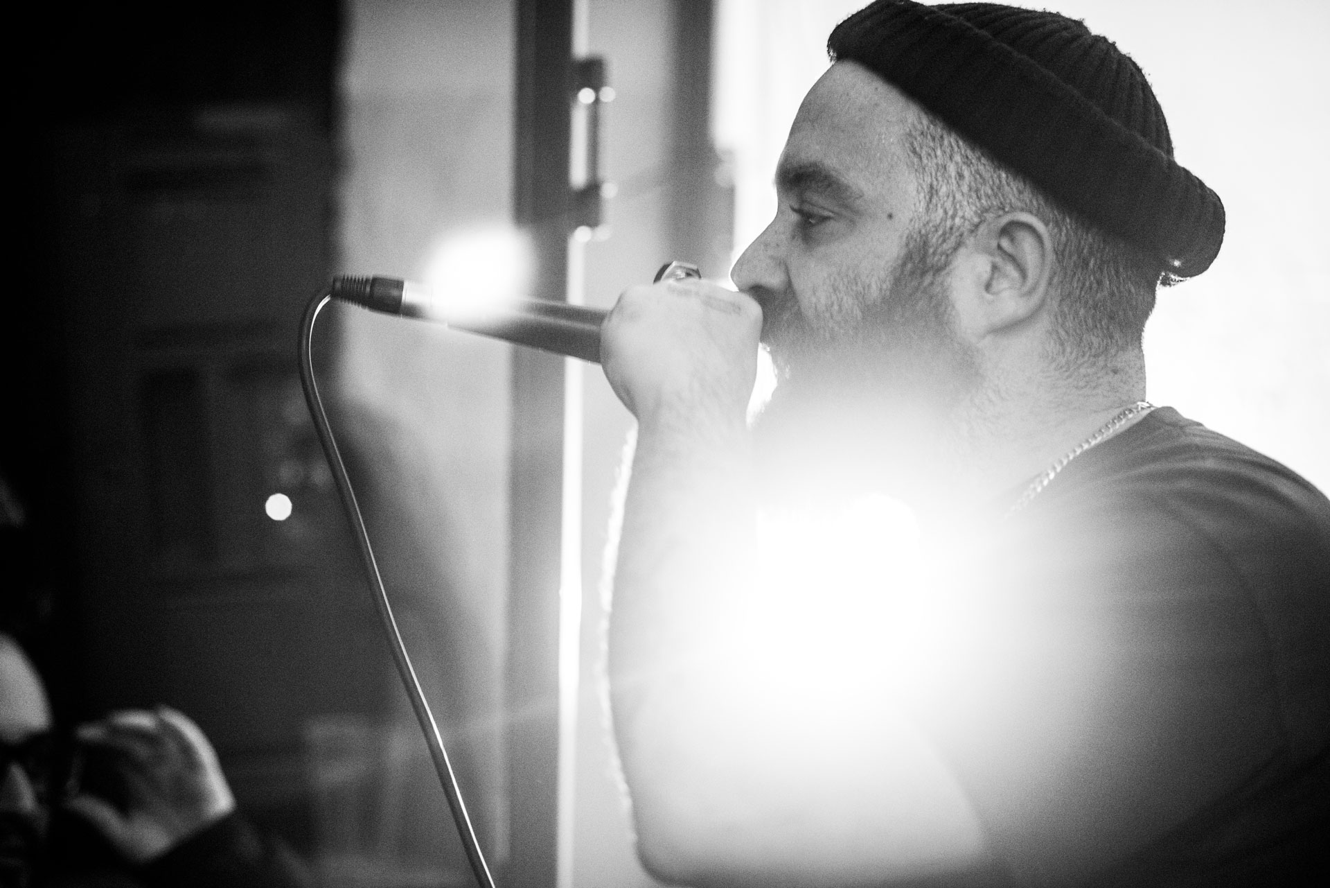“Le prime due foto sono state scattate in auto, durante il viaggio. Ho usato l’effetto mosso per dare l’idea della dinamicità di ciò che stavamo compiendo. Ho optato per questo effetto anche nelle foto del live, è un linguaggio che sto sviluppando ultimamente perchè ritengo rappresenti in modo molto espressivo l’atmosfera respirata durante le esibizioni degli artisti. D’altronde, anche nelle chiacchierate con Luca (Blo/b) e Matteo (Gioielli) emerge spesso l’idea di sporcare le cose in modo volontario, dopo aver preso coscienza della loro natura. Ci piace farlo in questo modo, si può dire che il loro rap abbia influenzato sia direttamente che indirettamente il mio stile fotografico. Tramite i miei scatti, cerco di completare quello che loro esprimono col microfono, così da creare un’esperienza completa. Con loro due mi trovo benissimo e c’è una grande energia e sintonia, dovuta sicuramente anche dall’amicizia che abbiamo costruito. Ci sono tutti i presupposti per andare avanti. Restate sintonizzati perchè dall’ idea di questo reportage me ne è venuta un’altra ancora più grande: voglio ricostruire tramite le mie foto tutto questo periodo, che ha condotto all’uscite di tre album e non solo. Un sintesi di questa cosa davvero speciale”