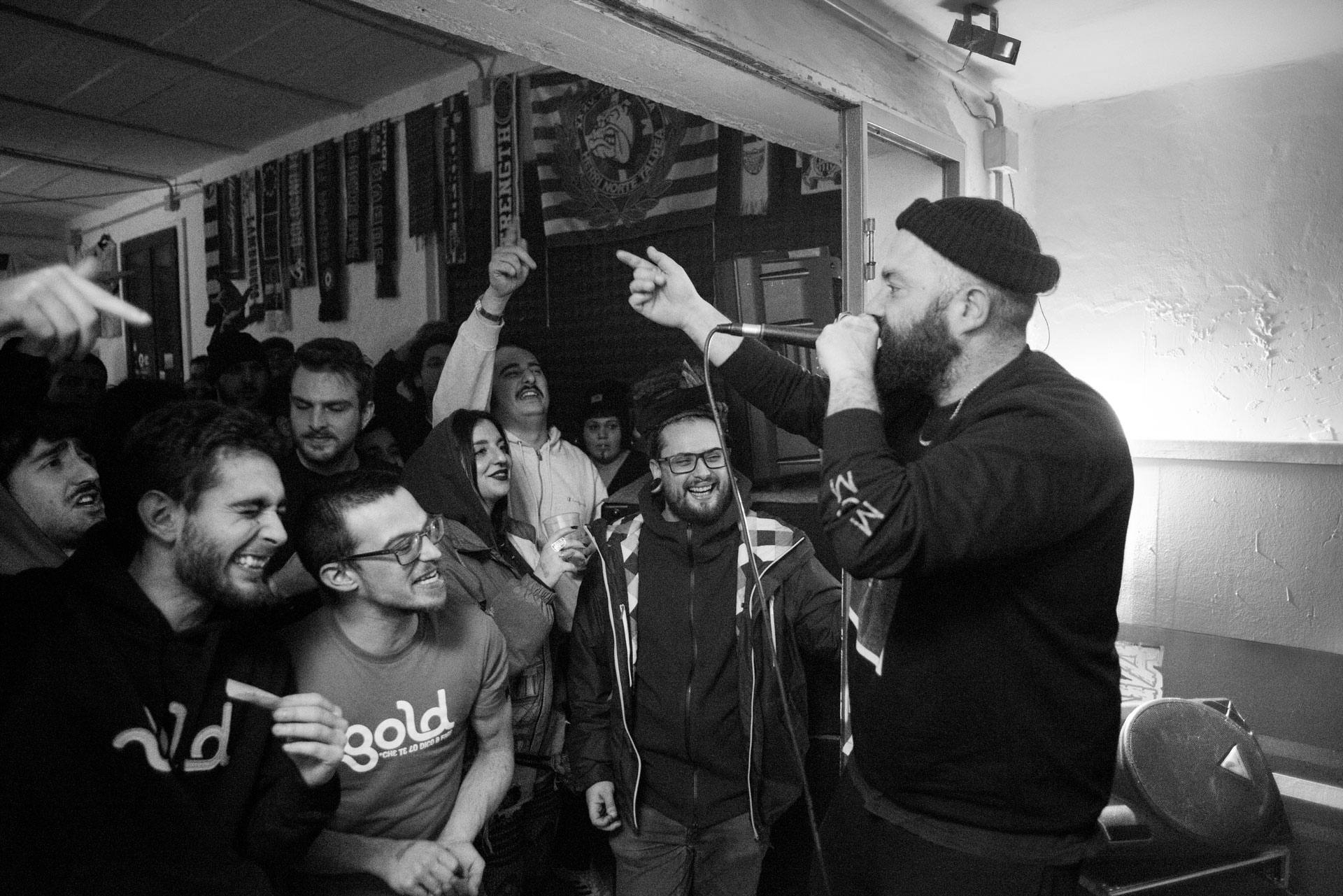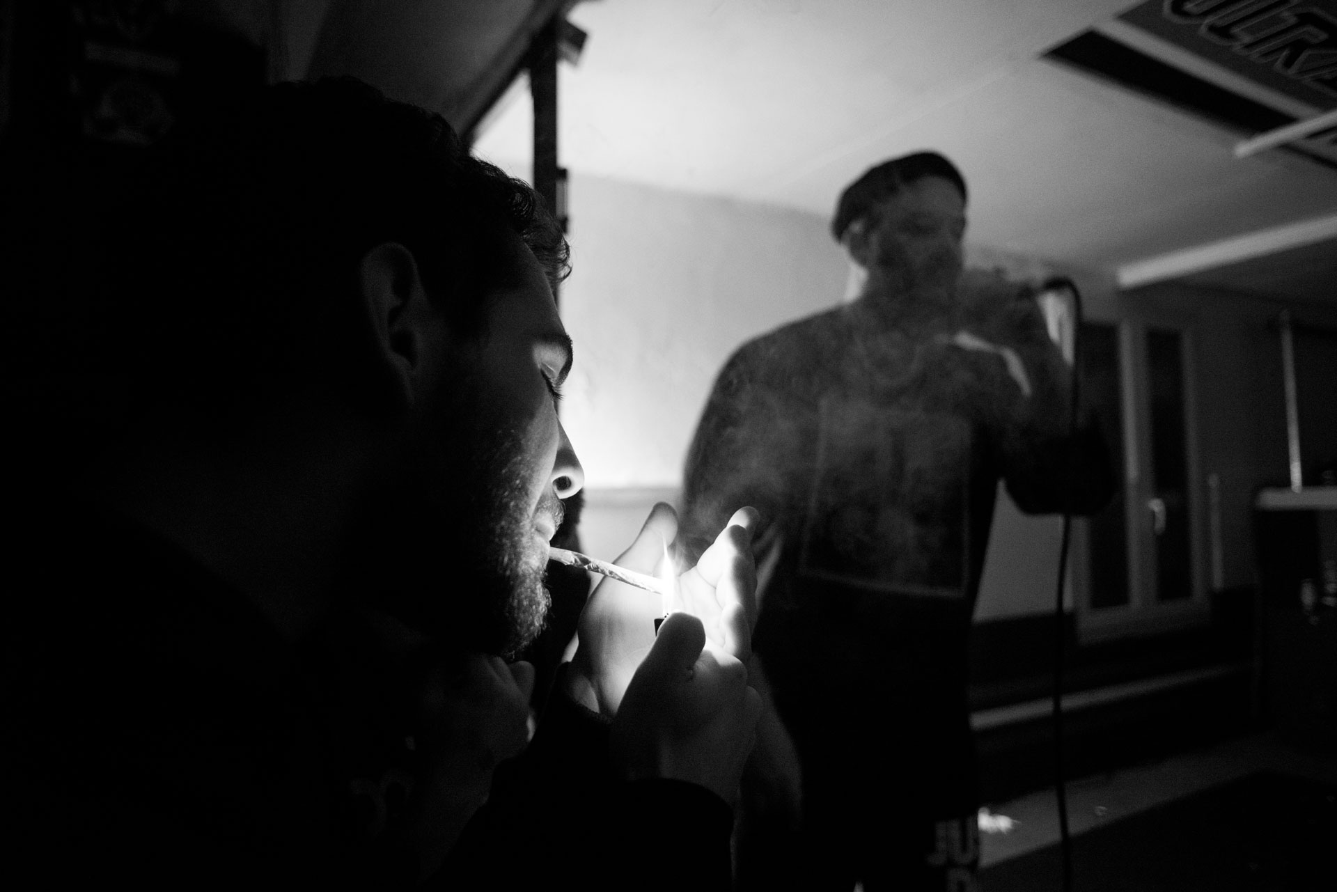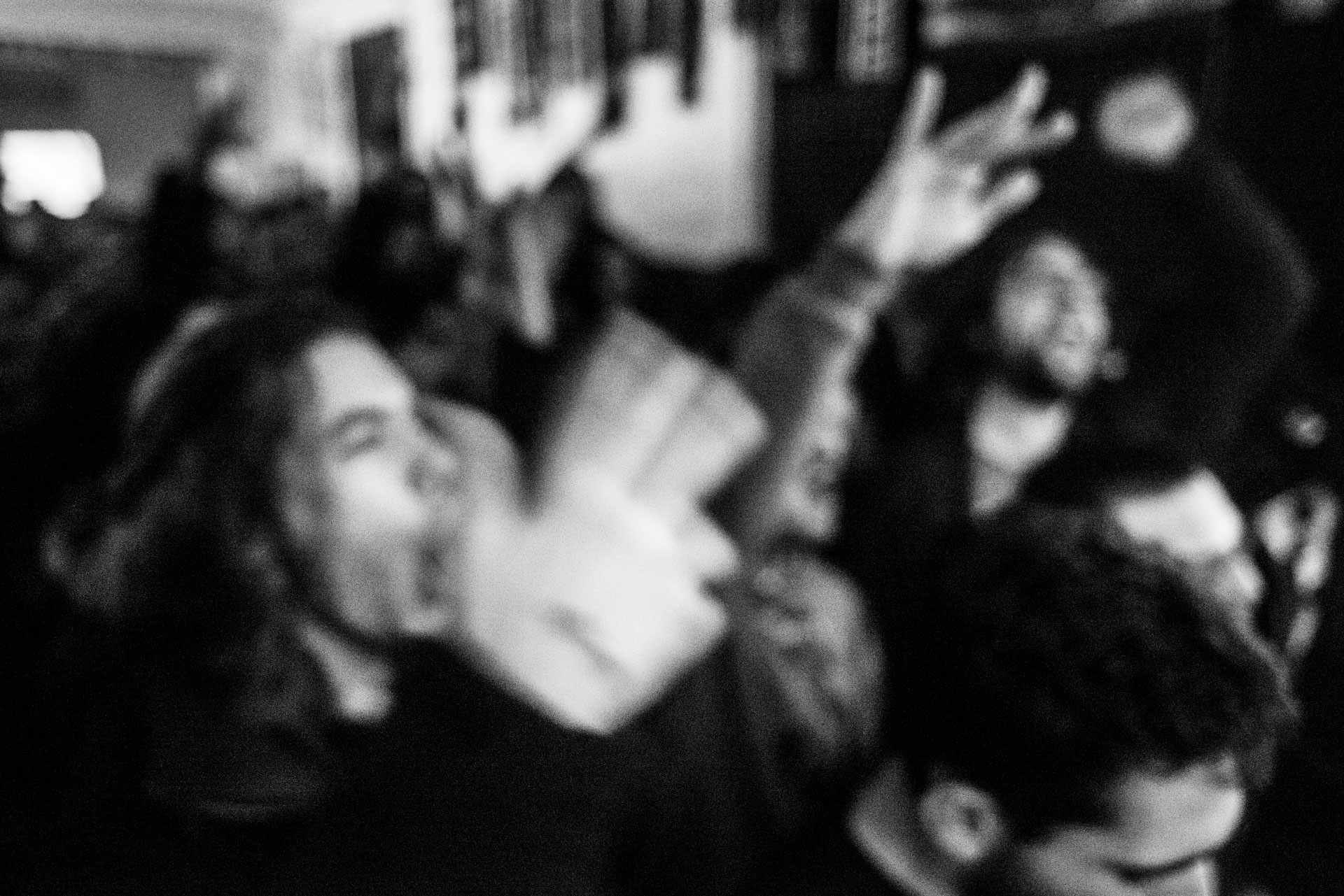 “Le prime due foto sono state scattate in auto, durante il viaggio. Ho usato l’effetto mosso per dare l’idea della dinamicità di ciò che stavamo compiendo. Ho optato per questo effetto anche nelle foto del live, è un linguaggio che sto sviluppando ultimamente perchè ritengo rappresenti in modo molto espressivo l’atmosfera respirata durante le esibizioni degli artisti. D’altronde, anche nelle chiacchierate con Luca (Blo/b) e Matteo (Gioielli) emerge spesso l’idea di sporcare le cose in modo volontario, dopo aver preso coscienza della loro natura. Ci piace farlo in questo modo, si può dire che il loro rap abbia influenzato sia direttamente che indirettamente il mio stile fotografico. Tramite i miei scatti, cerco di completare quello che loro esprimono col microfono, così da creare un’esperienza completa. Con loro due mi trovo benissimo e c’è una grande energia e sintonia, dovuta sicuramente anche dall’amicizia che abbiamo costruito. Ci sono tutti i presupposti per andare avanti. Restate sintonizzati perchè dall’ idea di questo reportage me ne è venuta un’altra ancora più grande: voglio ricostruire tramite le mie foto tutto questo periodo, che ha condotto all’uscite di tre album e non solo. Un sintesi di questa cosa davvero speciale”