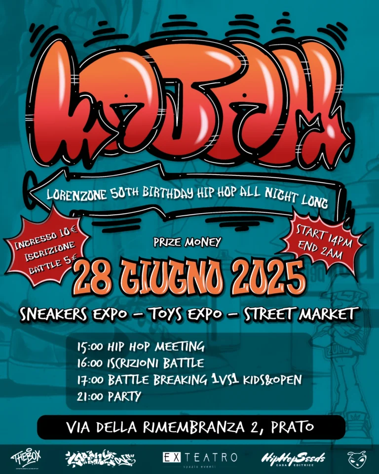 Il 28 Giugno 2025 in Via Della Rimembranza 2 a Prato all’Ex Teatro, ci sarà il 50° compleanno di Lorenzone: b-boy toscano con un curriculum alle spalle da finire Linkedin (Zulu Nation in primis, ma non solo), credetemi. Uno dei b-boy che hanno portato i più grandi esponenti della cultura Hip Hop in Italia, per dire.