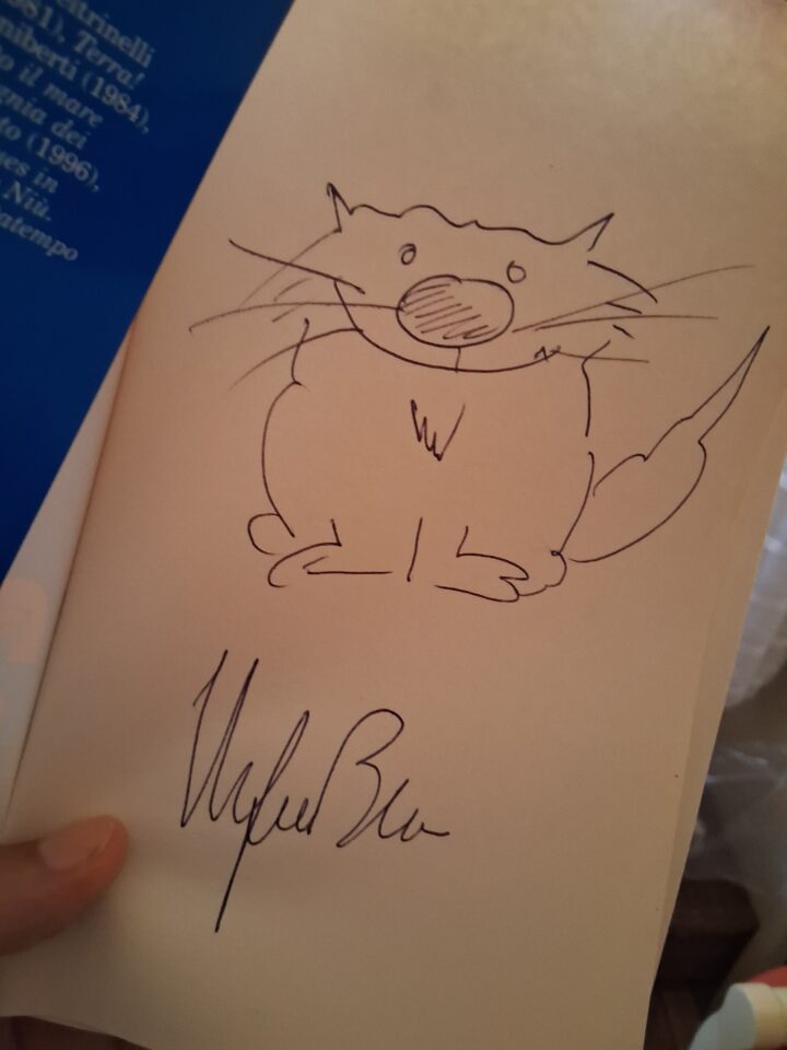 Gli chiesi di disegnare un gatto sul libro (Achille Piè Veloce) perché la mia insegnante mi aveva mostrato i suoi disegni, e lui immediatamente mi chiese se per caso avessi una tresca con lei, facendomi avvampare.