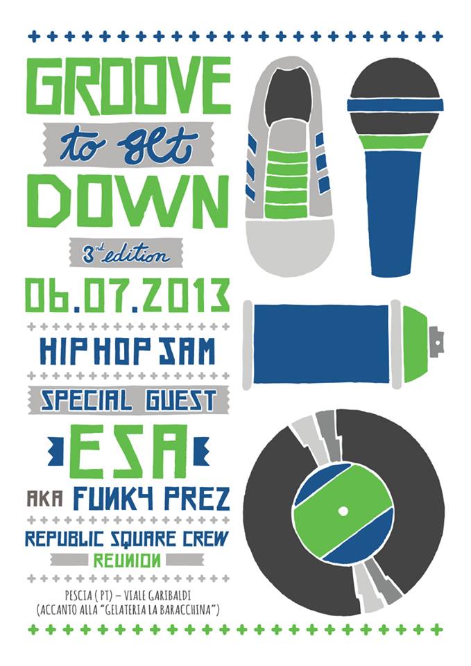 Sabato 6.7.2013 a partire dalle ore 15.00: Groove to Get Down – HH Jam in Viale Garibaldi a Pescia (PT) accanto alla Gelateria La Baracchina – a seguire intorno alle ore 21.00 After Party fino alle 3.00 presso La Fabbrica dell’Ossi– Via Fiorentina (sempre a Pescia) – il locale è vicinissimo alla jam.
