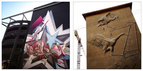 Titolo: Graffito tridimensionale di Daim, a sinistra, e Gru nella battaglia di natura e tecnologia, a destra