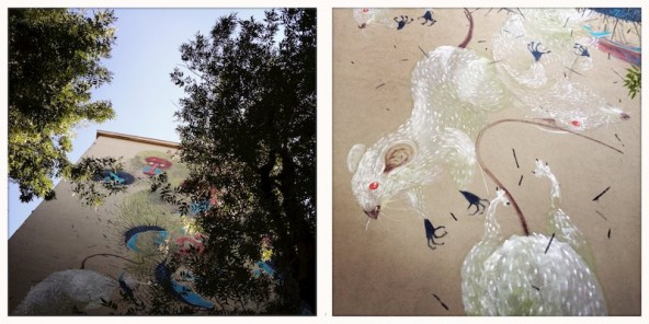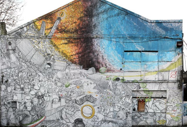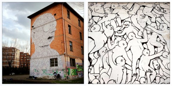 È il gioco della street Art: funziona così; disegni che vanno e che vengono, scritte che si sbiadiscono, opere d’arte che scompaiono come ‘Ultime cene’. Certo preferirei che fosse soltanto il tempo a giocare le sue scomode carte – non l’ignoranza, non l’urgenza di piccoli e mediocri vantaggi. E invece tristi esempi mi confermano il contrario: il murales sulla parete esterna dell’XM24, per esempio, quello del marzo 2013, anche quello rischiava, a quanto ne so, di sparire. Il Comune aveva in progetto l’abbattimento dell’intero edificio dell’ex mercato (con conseguente irrimediabile perdita della significativa opera di Blu che vi è impressa sopra). Fortunatamente in questo caso la rotonda che avrebbe dovuto asfaltarlo si sposterà un pochino più in là. L’edificio rimane al suo posto, e con lui – spero – la sua bella “funzione” di sketch book all’aperto, le cui pagine – o muri – vengono periodicamente rinnovate dalle mani esperte di artisti (non dalle braccia meccaniche di una ruspa).