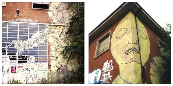 In via Zanardi, nel quartiere Marco Polo, all’altezza del passaggio a livello, ci sono inconfondibili tracce di Blu ed Ericailcane. Naturalmente sopra edifici attualmente abbandonati – e quindi esposti ai rischi del gioco della strada. Un vero peccato, che pochi subiscano il fascino del delabré. Anche questi murales rischiano di sparire presto al mio sguardo-in-volo di girovaga in bicicletta.