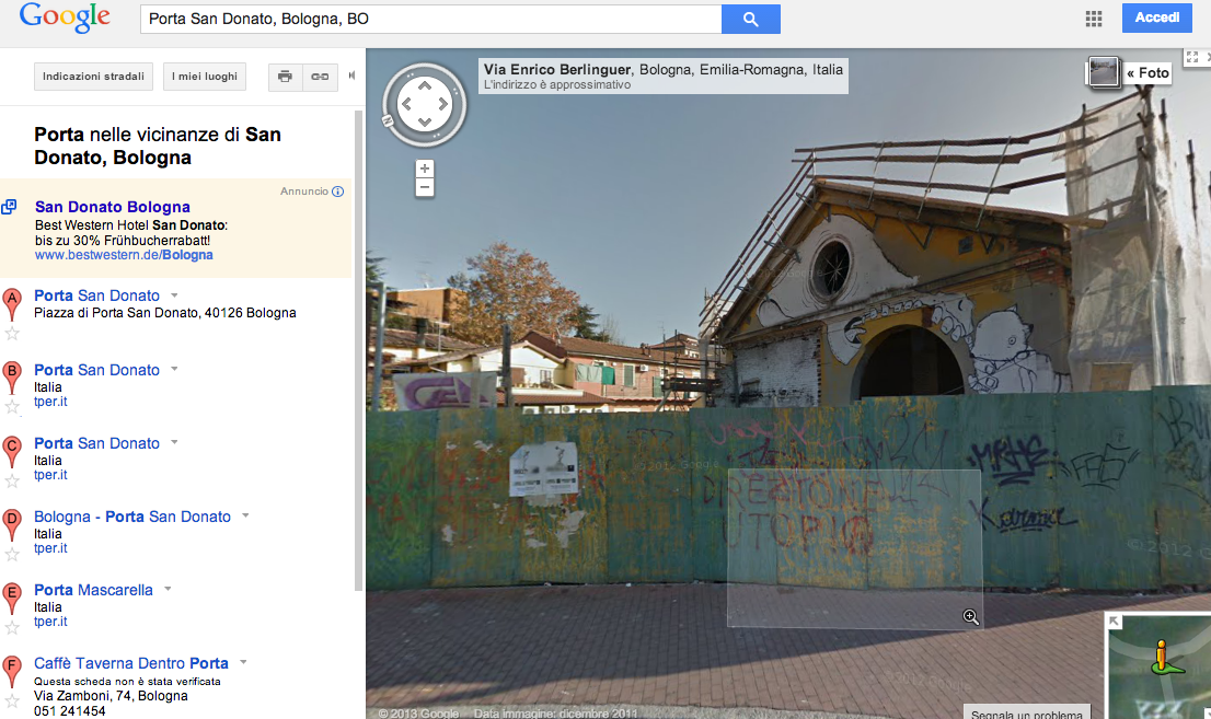 Qualche mese fa pedalavo sul mio agile mezzo di locomozione, quando, spostando lo sguardo sulla destra – un attimo prima di salire sul ponte di San Donato – ho realizzato che non c’era più il fondamentale catalizzatore della mia consueta occhiata volante: l’ultimo rimasuglio del graffito firmato Blu e Ericailcane, del 2005, credo.Una specie di testa di mostro che mi guardava sempre, con il suo occhio bianco un po’ inquietante un po’ affettuoso, mentre lo sorpassavo per tornare a casa. Immediata conseguenza di forte sconforto e sentimento di acuta desolazione e avvilimento. Anche Google Maps si rifiuta, insieme a me, di accettare l’affronto e, nella sua street view, mantiene inalterata la foto con graffito.