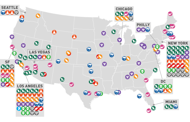 Come facilmente si può prevedere, New York è in testa, con 35 distruzioni cinematografiche, seguita da Los Angeles, 34: in ogni caso le città preferite sono quelle sulla costa, mentre il Midwest con North Dakota, Montana, Idaho, e Kansas sono abbastanza neutre alla rabbia apocalittica. Fate le vostre scelte d’attrattive, ma vi abbiamo avvisati.