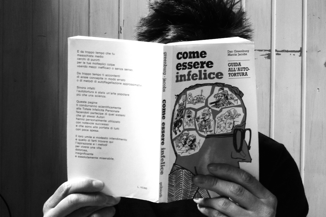 Ho trovato nella totale casualità alcuni dei testi più originali, geniali, trash e interessanti che possano mai ammuffire tra gli scaffali dei librai più pregiati, per non parlare dell’oceano che trema in un maelstrom delirante di testi e copertine alle varie librerie commerciali. L’ultimo mio acquisto infatti è stato per il solito irrisorio, perfetto prezzo di 99 cent il libro: Come Essere Infelice, sotto titolato “Guida all’Auto-Tortura” di Dan Greenburg e Marcia Jacobs (1966).