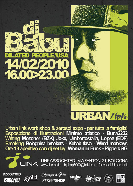 Questa Domenica 14 Febbraio dalle ore 16.00 fino alle 23.00, presso il Link di Bologna si terrà un nuovo appuntamento “Urban Link“ in partnership con Gold con la presenza di un super ospite: Dj Babu from Dilated Peoples, celebre per far parte anche della leggendaria Beat Junkies crew assieme ad altri luminari dello scratch come J.Rocc, DJ Curse , Rhettmatic, Melo-D, “DJ What?!”, Mr. Choc, e Shortkut.