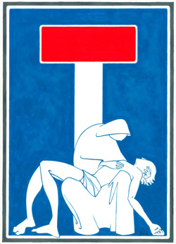In quel periodo venivo presto in studio per studiare i cartelli stradali al fine di farci un lavoro sopra e realizzai quest’opera che in una frase misi da parte in quanto il messaggio che comunicava era molto forte che quasi mi impressionava.