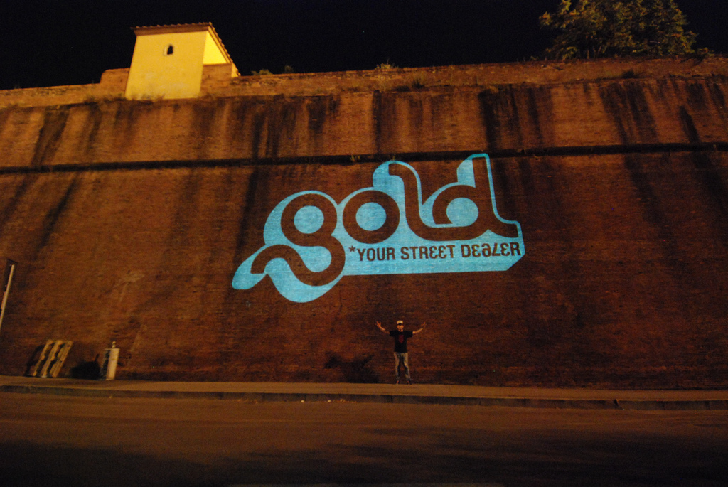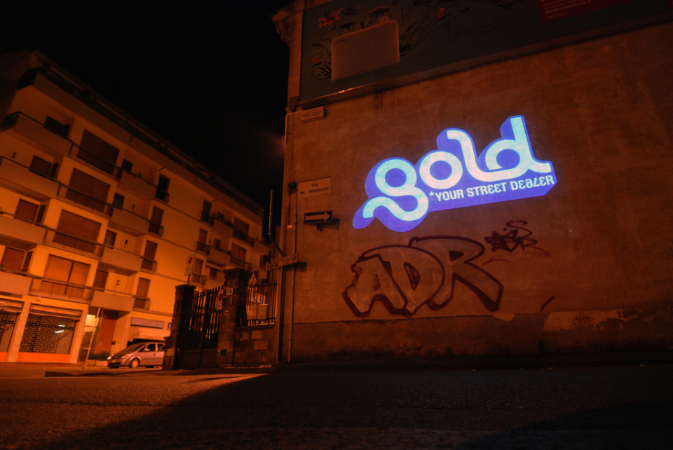 Per la realizzazione dell’idea dello street artist MONEYLESS si sono mosse 4-5 persone del team che, armate di proiettore, generatore e computer si sono mosse per la città proiettando la scritta GOLD.