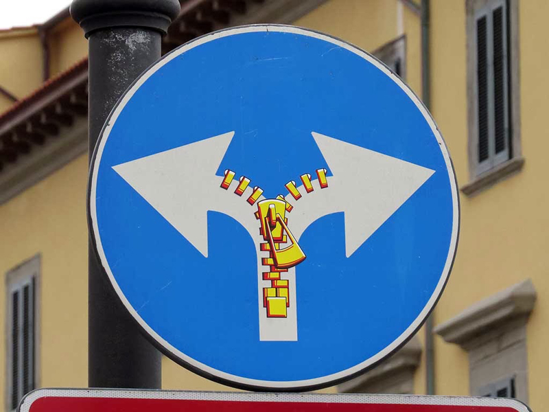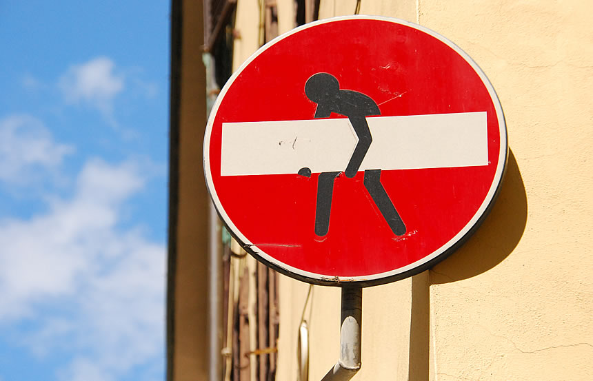 Il vicolo cieco viene così trasformato in un Cristo crocifisso, l’obbligo di svolta diventa Pinocchio, il divieto di accesso viene mangiato da PacMan.