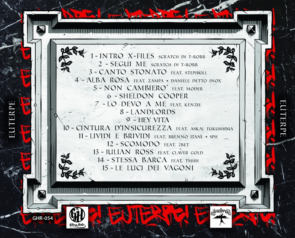 Più che per la Grecia ho una passione spropositata per il modello della metro di Atene ahah, ma non ci sono mai stato e mi piacerebbe visitarla e magari pittare. Comunque l’idea del titolo è di Rogo, si può dire che è l’unica richiesta che ha fatto per questo disco e a dire la verità a me è piaciuta subito. “Euterpe”, che sembra una parolaccia, è il nome della musa della musica greca; un concept che mi ha permesso di non avere paletti nei testi, visto che era la musica il vero ed unico filo conduttore. Ho potuto mettere tutto me stesso, come ad esempio i graffiti – che sono una parte abbondantissima della mia vita – ed altre passioni, emozioni e sentimenti, sempre libero da ogni costrizione, visto che dovevo seguire semplicemente la parola musica.
