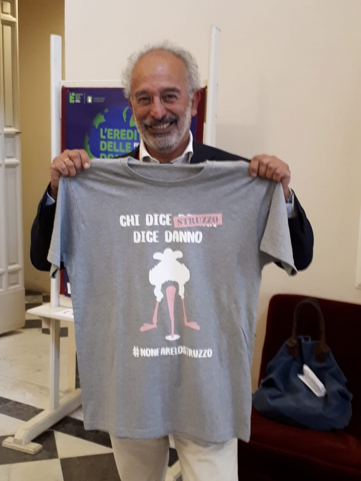 Il nostro struzzo ha la faccia antipatica, proprio di chi non ci fa caso. Non pensa. Non sceglie. Non si schiera dalla parte delle donne.