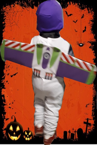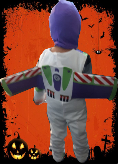 Il giorno dopo il tre enne e l’ingegnere sono andati a comprare una stecchetta leggera ma lunga quanto le ali, costo €0,80. Con il bi adesivo l’hanno attaccata. Il tre enne è stato finalmente pronto per l’infinito e oltre!