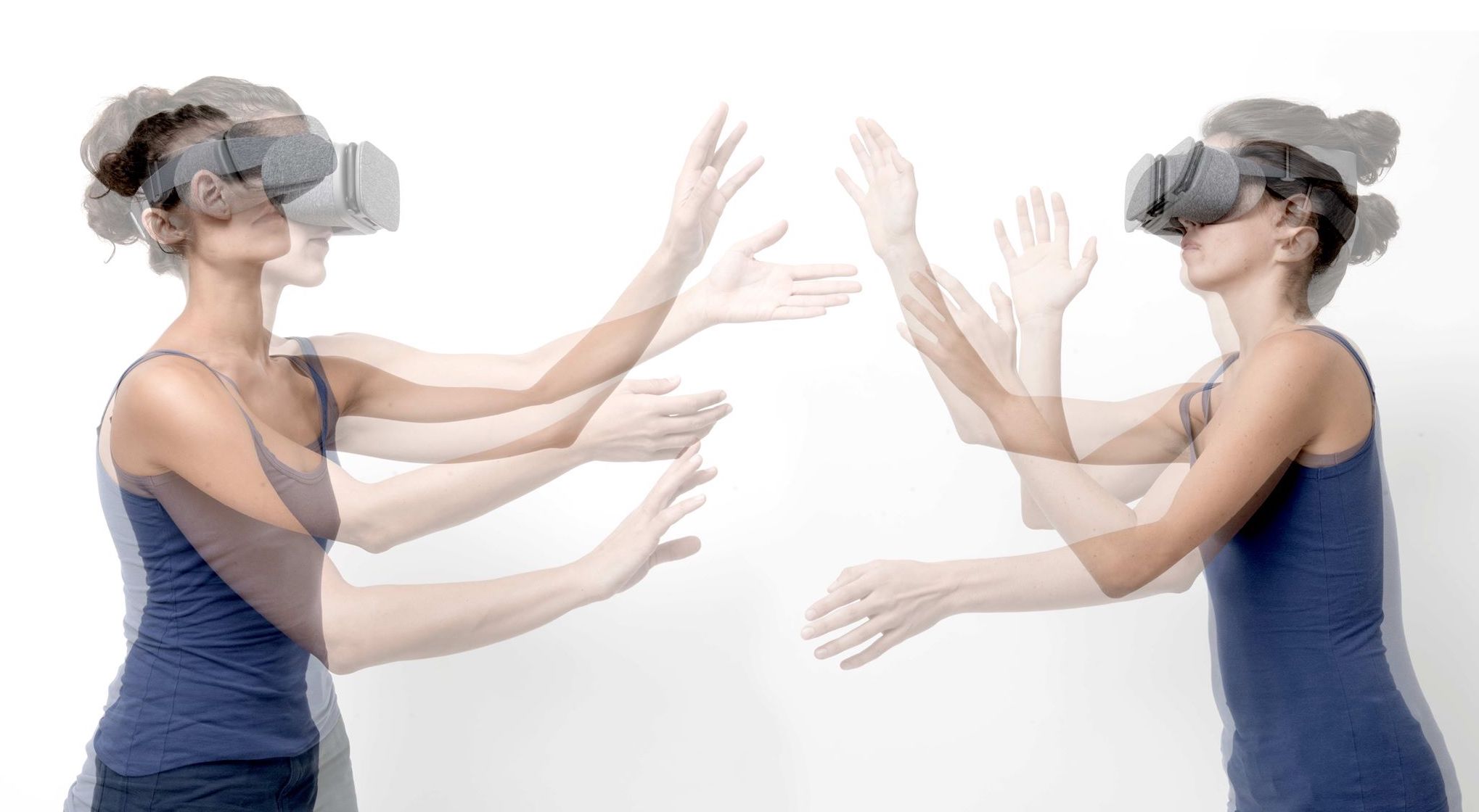 Dalla frontalità schiacciante di una proiezione o di uno schermo televisivo, si passa alla libertà dello smartphone che obbliga però la relazione mano-occhio a diventare vincolo, fino alla libertà motoria offerta dal visore a patto però della perdita di relazione visiva con l’esterno. Può però questa perdita visiva diventare stimolo tattile? Due persone si abbracciano nella cecità dei loro visori, guidati ognuno dalla propria traccia coreografica.