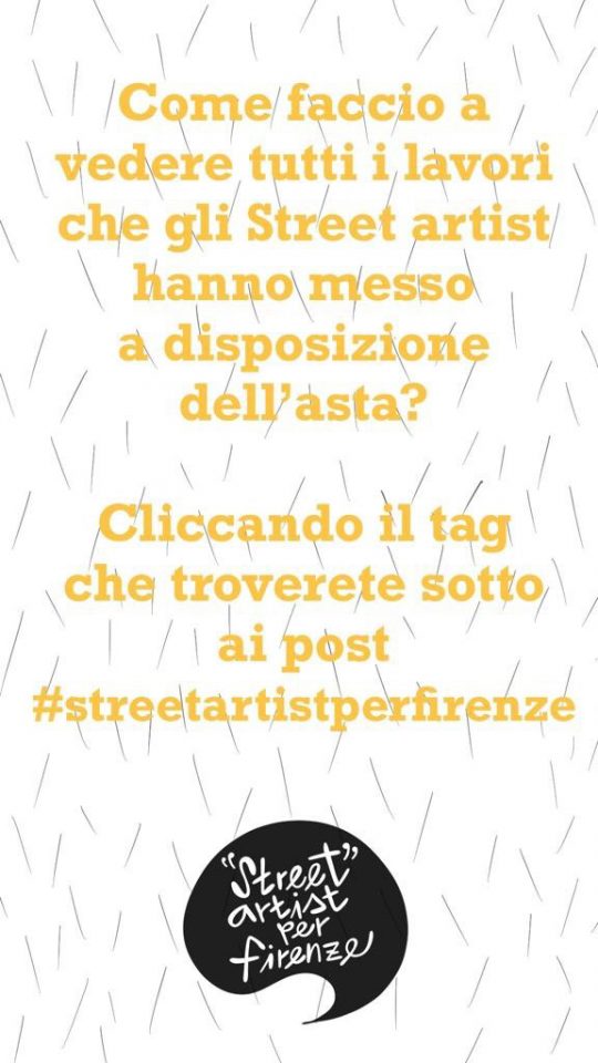 Gli Street artist pubblicheranno sul proprio profilo l’opera con l’hashtag #streetartistperfirenze sotto cui troverete tutte le opere messe all’asta dagli artisti.