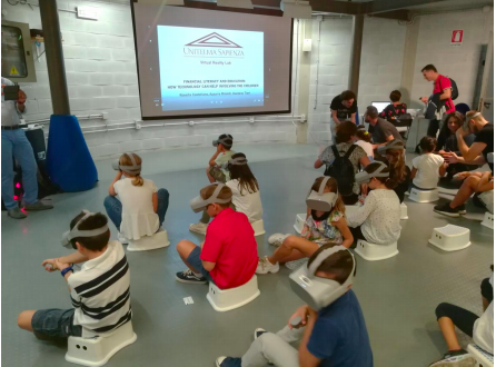 Il team dell’Università Unitelma Sapienza composto dalla dottoressa Azzurra Rinaldi, Ricercatrice di Economia Politica e il dottor Gaetano Tieri hanno creato un video game in VR pensa per bambini e bambine dai 6 ai 10 anni. Il dott. Tieri ha curato programmazione e modellazione grafica del video game in qualità di Psicologo e Ricercatore in Neuroscienze Cognitive e Sociali della Sapienza e del Laboratorio di Realtà Virtuale Immersiva e ha risposto alle milioni di domande di cui le classi entusiaste li hanno sommersi.