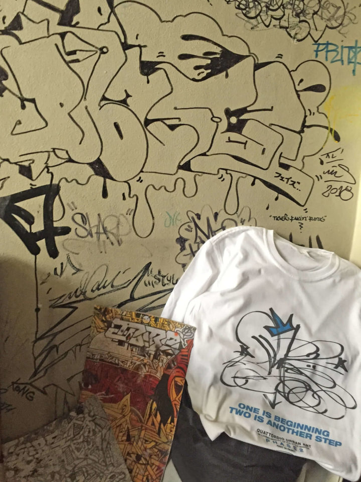 - Con donazioni corrispondenti o maggiori a 30€ si potrà ricevere una t-shirt commemorativa dedicataa Phase 2; raffigurante la firma di una sua un’opera originale, conservata da un cittadino di Quattordio.