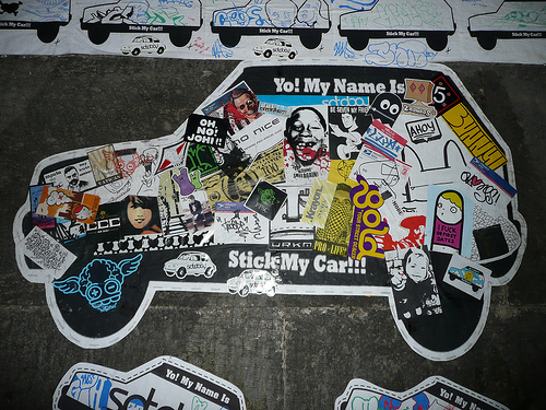 Difficile rispondere, ci sono un sacco di buone idee in giro e spesso sono molto apprezzate all’estero (un piccolo made in italy) ma la questione è un’altra: uno sticker è un medium talmente “democratico” che consente a chiunque con un po’ di iniziativa di avere un pubblico per sentirsi artista, diffondere un messaggio, ottenere visibilità o solo pubblicizzare un prodotto, rappresenta quindi un punto di convergenza di persone molto diverse tra loro per background, finalità, interessi, budget, nonché capacità artistiche, tecniche e di distribuzione, che vede coinvolti “street-artist”, pittori, illustratori, designer, guerriglieri del marketing, fotografi, poeti, pubblicitari, aziende, etc. insomma un mondo molto eterogeneo nel quale il confine tra “arte” e “prodotto”, tra “artista” e “azienda”, tra “propaganda” e “pubblicità” è molto labile e spesso volutamente confuso, quindi cos’è poi questa sticker art? Detto questo vorrei vedere più disegni attaccati sui muri delle nostre strade, magari rielaborare la tradizione dei murales per mezzo degli sticker e poi non sarebbe male qualche sticker-combo (ndr collage di adesivi) in più in giro, ci sono tante cose brutte da ricoprire magari anche nell’ottica del riciclo creativo, ma te l’ho detto che domenica ricopriamo dal vivo una vecchia fiat panda con migliaia di adesivi arrivati da tutto il mondo?