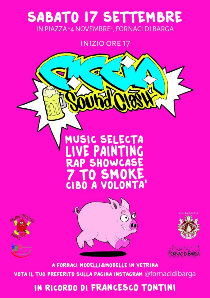 Ciccia Sound Clash è una festa dove verranno saziati gli appetiti delle teste Hip Hop, oltre che quelli più naturali delle pance nostrane. Oltre a live painting, battle di breaking e showcase di rap, il gruppo marciatori Fidas di Fornaci sarà presente con stand gastronomici a base di ciccia, da qui il nome dell’evento.