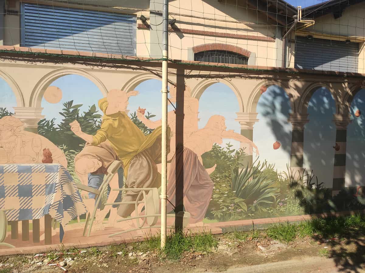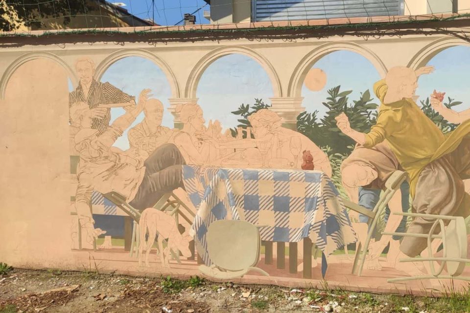 L’opera di arte murale dei due artisti raffigura un banchetto in un giardino ed è ispirata a un’usanza chiamata “Mangia come parli”: una tradizione degli abitanti del quartiere che per molti anni erano soliti portare cibi tipici del loro paese di origine da condividere con gli altri nel giardino di San Jacopino.