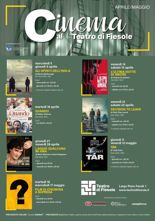 Continuando con i film internazionali, proponiamo anche il coreano Decision to Leave (un vero capolavoro) di Park Chan-Wook (21 e 22 aprile) e TÀR di Todd Field (11 e 12 maggio), un film sul potere che oltre ad essere bellissimo e politicamente rilevante, è ambientato in un teatro e ci è sembrato obbligatorio proporlo nel nostro contesto.