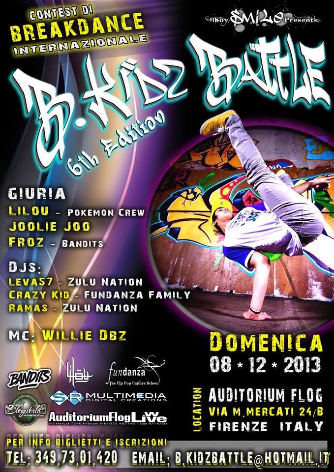 Esatto! In Italia dobbiamo aprirci un po’, far arrivare la cosa a tutti, sfruttare le nostre potenzialità, in tutte le discipline. Il B.Kidz Battle, nel suo piccolo, cerca quindi di essere un evento aperto e dedicato a tutti, appassionati della cultura hip hop e non solo, per chi ci sta dentro oggi o chi si sbatteva tempo fa: dagli allievi, agli insegnanti, fino a coinvolgere i genitori e le famiglie dei piccoli ballerini in erba, un evento alla fine per chi è semplicemente amante della buona musica, che per l’occasione sarà esclusivamente su vinile, dal Funk, Rap, Breakbeats, Disco Funk e tutto il meglio della black music! Quindi se volete supportare noi e questo mondo siamo all’ Auditorium Flog l’8 Dicembre di questo 2013. Vi aspettiamo per accogliervi come parte della famiglia!
