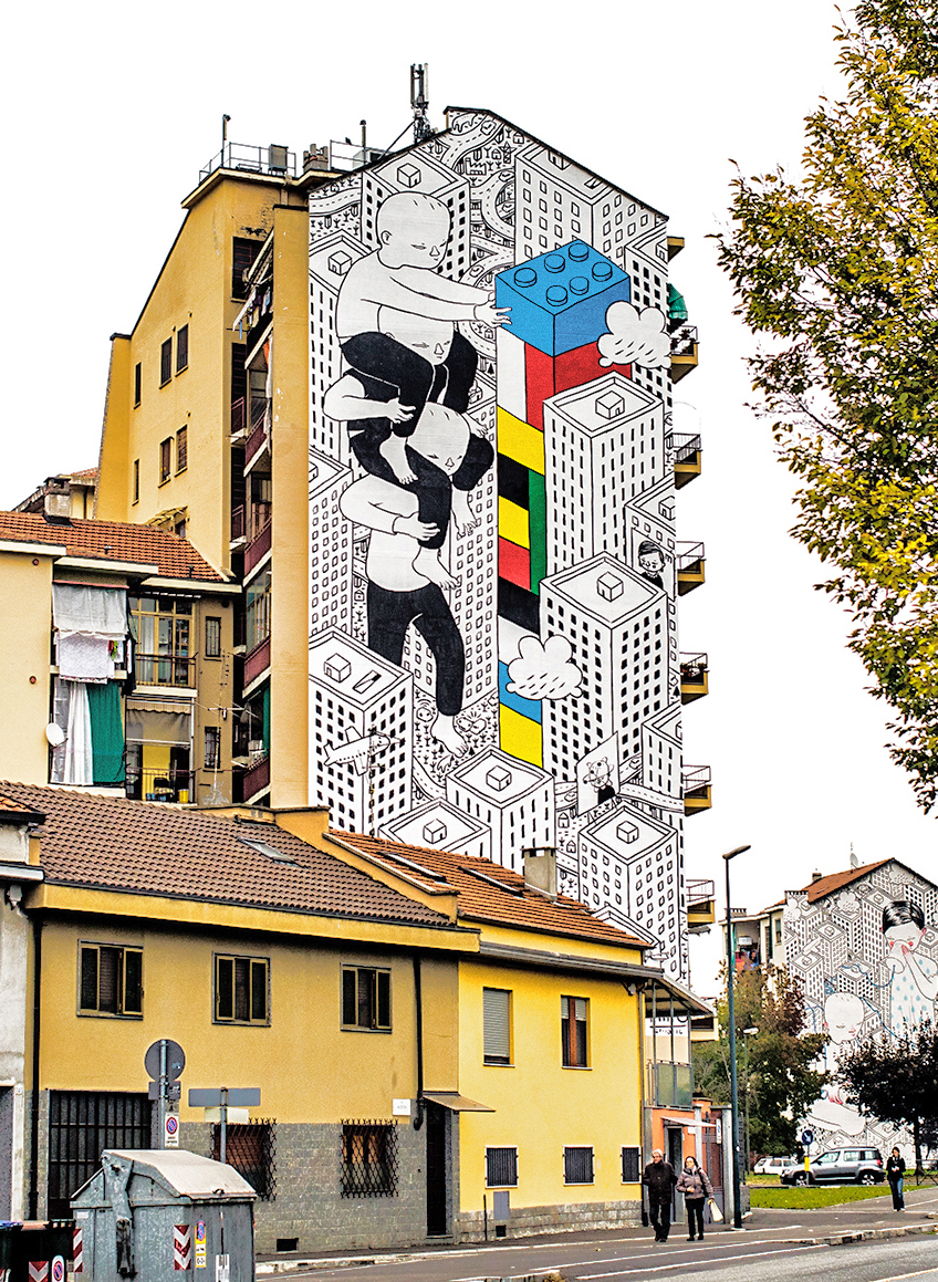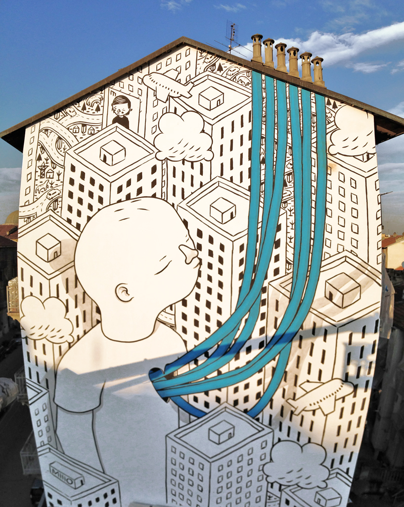 La passione per il disegno mi ha sempre spinto a cercare nuovi supporti su cui dare sfogo alle mie idee, è così che è avvenuto il passaggio dalla carta alla strada. Coltivo ancora entrambe le cose, anche se nell’ultimo periodo mi sono concentrato particolarmente sulla realizzazione delle 13 facciate per il progetto Bart (arte in barriera) a Torino, di cui sono risultato il vincitore. Non ho veri e propri punti di riferimento, sono solito mescolare quello che osservo e seguo, dall’architettura all’arte, dalla musica alla letteratura, mi definirei attento a tutto quello che mi circonda ma senza punti di riferimento fissi.