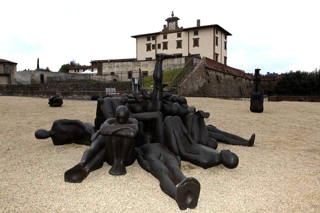 Più di cento sculture raffiguranti figure umane collocate nelle sale interne della palazzina, sui bastioni, scalinate e terrazze, occupano ogni lato della fortezza cinquecentesca, dialogando con il panorama, indagando sull’idea di evoluzione umana.