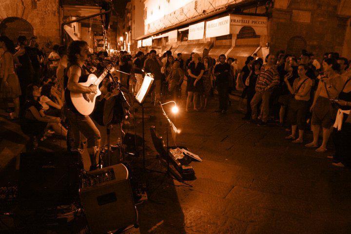 Si tratta di una tastiera, una chitarra, un leggìo appoggiati sopra due teli rossi. Semplici arnesi del mestiere per provocare l’incanto tra i passanti. Tutto autorizzato, se non fosse che la strumentazione sia stata preparata appena dieci minuti prima delle 20, orario dell’inizio ufficiale della performance.