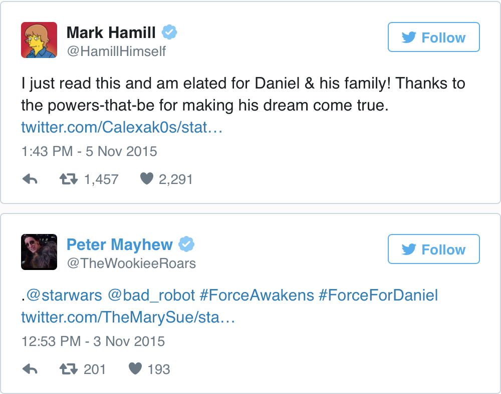 “Oggi i meravigliosi studios Disney e Lucasfilms hanno fatto in modo che un sogno diventasse realtà, nella straordinaria maniera che solo Disney possiede!” ha scritto la moglie. “Daniel ha appena finito di vedere la versione non ancora ufficiale de Il Risveglio della Forza!!! Vogliamo ringraziare il regista di talento JJ Abrams per aver chiamato Daniel e avergli permesso di realizzare il suo sogno!”