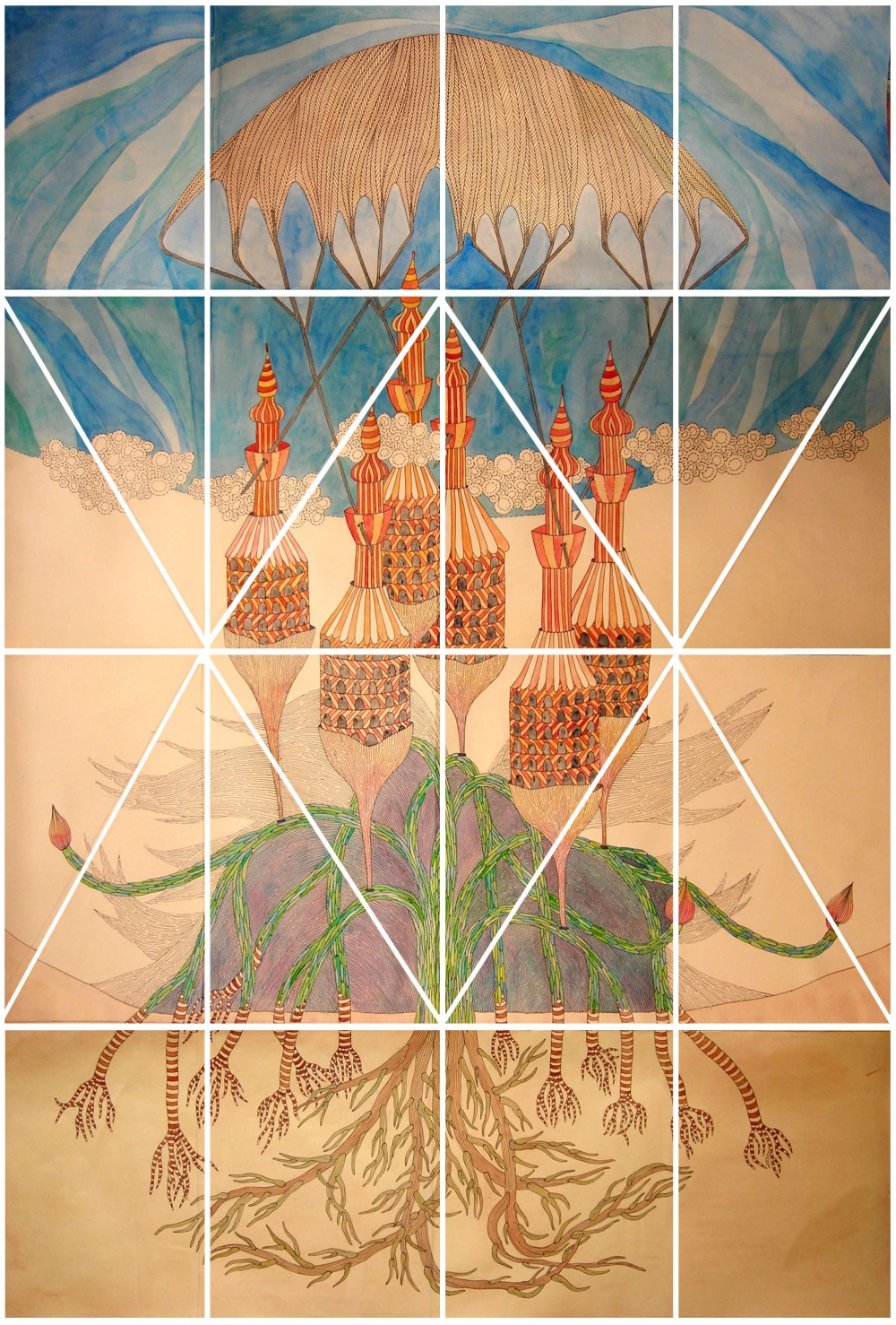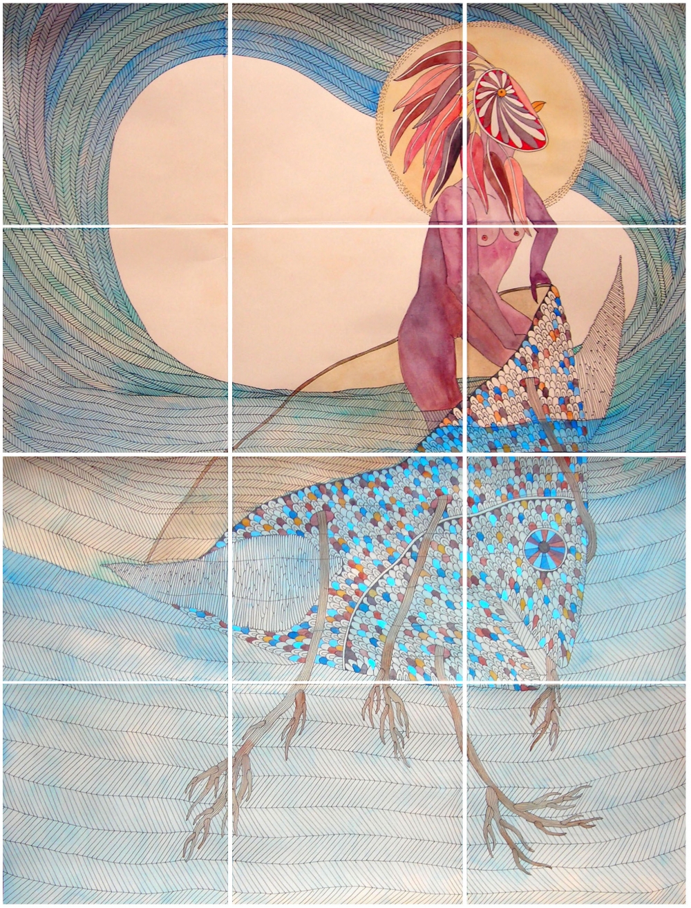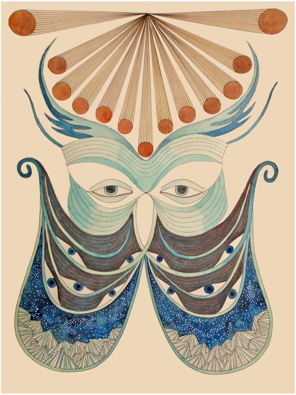Impiego un sacco del mio tempo leggendo e facendo ricerca riguardo idee che mi vengono in mente, o soggetti in cui sono interessata. Una volta in cui mi sono creata una chiara immagine in testa solitamente comincio a disegnare direttamente su carta- raramente faccio sketch prima- e dunque aggiungo poi inchiostro e pittura. A volte coloro la carta prima di cominciare. Se sto lavorando su pezzo di carta che si piega allora la piego e applico tagli prima che cominci a disegnare. Utilizzo anche un notebook dove prendo note scritte ma praticamente non faccio mai studi delle cose. I miei sketch sono più fatti di parole che di immagini. Per i lavori piegati, generalmente piego la carta prima che cominci a disegnare e dopo che ho finito il dipinto lo ripiego lungo le stesse linee per conservarlo. Spesso riesco a piegarlo in una più piccola figura geometrica, e allora i dipinti diventano oggetti. In questo modo la carta stessa è parte della narrativa. Mi piace immaginare che un giorno nel futuro qualcuno possa incappare in questi lavori piegati in un libro o in un cassetto e che poi li aprano, trovando questa strana specie di lavori, con creature e indizi da un altro tempo.