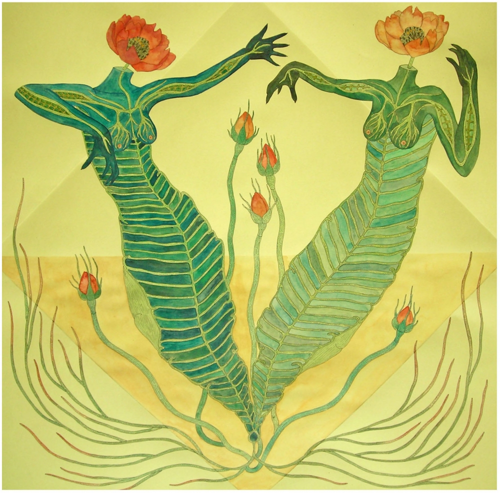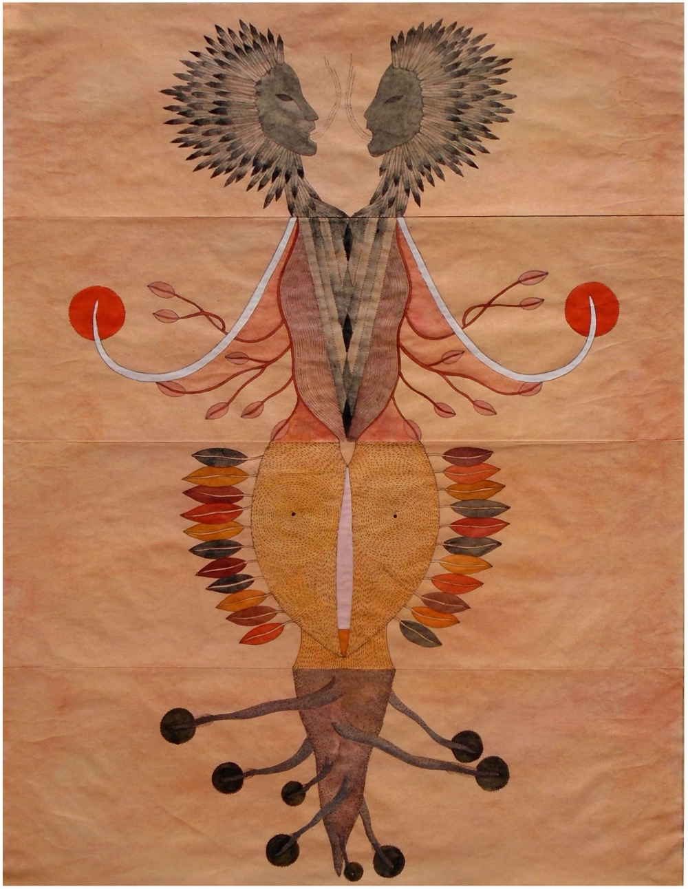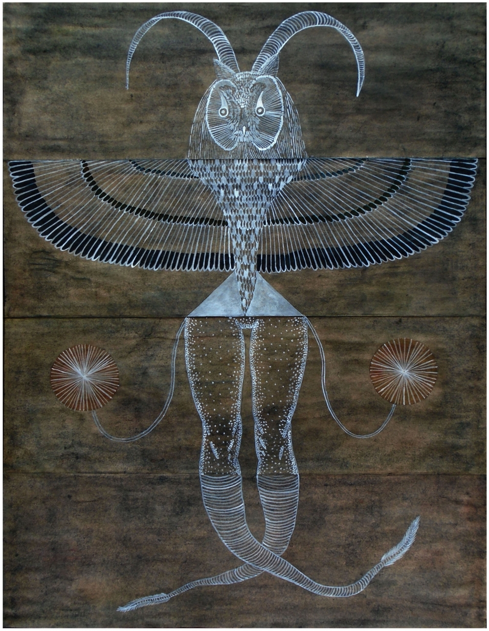 Impiego un sacco del mio tempo leggendo e facendo ricerca riguardo idee che mi vengono in mente, o soggetti in cui sono interessata. Una volta in cui mi sono creata una chiara immagine in testa solitamente comincio a disegnare direttamente su carta- raramente faccio sketch prima- e dunque aggiungo poi inchiostro e pittura. A volte coloro la carta prima di cominciare. Se sto lavorando su pezzo di carta che si piega allora la piego e applico tagli prima che cominci a disegnare. Utilizzo anche un notebook dove prendo note scritte ma praticamente non faccio mai studi delle cose. I miei sketch sono più fatti di parole che di immagini. Per i lavori piegati, generalmente piego la carta prima che cominci a disegnare e dopo che ho finito il dipinto lo ripiego lungo le stesse linee per conservarlo. Spesso riesco a piegarlo in una più piccola figura geometrica, e allora i dipinti diventano oggetti. In questo modo la carta stessa è parte della narrativa. Mi piace immaginare che un giorno nel futuro qualcuno possa incappare in questi lavori piegati in un libro o in un cassetto e che poi li aprano, trovando questa strana specie di lavori, con creature e indizi da un altro tempo.